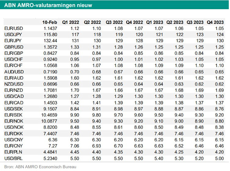 Sinds de uitkomst van de ECB vergadering van 3 februari heeft de euro het goed gedaan. De munt staat ongeveer 3% hoger ten opzichte van de Amerikaanse dollar. Het beter dan verwachte Amerikaanse banenrapport voor januari heeft de dollar wel wat steun gegeven. We hebben onze visie op de ECB deze week aangepast. We verwachten nu een gematigde stijging van de depositorente aan het einde van het jaar. We hadden eerst helemaal geen verhoging in 2022 en 2023.