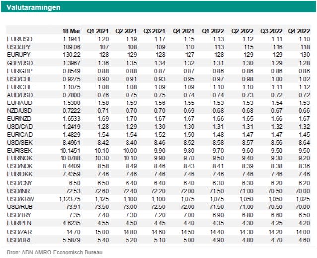 Vorige week was de ECB verruimingsgezind en dat drukte de euro. Gisteren kwam de Fed bijeen om te besluiten over het monetair beleid. En de verwachtingen waren hoog gespannen. Beleggers verwachtten dat de eerste renteverhoging in de eerste helft van 2023 kwam. De Fed stelde de ramingen voor economische groei aanzienlijk naar boven bij en verhoogde ook de ramingen voor inflatie en de werkgelegenheid. De Fed publiceerde ook een grafiek met hun verwachtingen ten aanzien van de toekomstige renteverhogingen (de zogenaamde dot plot). Deze grafiek liet zien dat de Fed de rente waarschijnlijk niet verhoogt voor het einde van 2023. Deze uitkomst was meer verruimingsgezind dan wat beleggers hadden verwacht maar ook meer verruimingsgezind dan onze vooruitzichten. Als gevolg hiervan daalde tijdelijk de tienjaarsrente op Amerikaanse staatsobligaties (deze steeg weer vandaag). De dollar daalde ook. De dollarindex daalde van 92 naar 91.4 en USD/JPY van 109.25 naar 108.80, terwijl EUR/USD steeg van 1.1910 tot 1.1980.