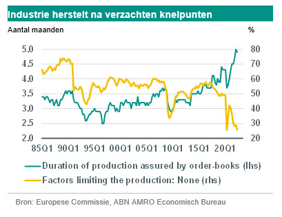 Ook de industrie zal in het tweede halfjaar van 2022 waarschijnlijk een positieve bijdrage leveren aan de groei. Ondanks dat er tekenen van een afkoelende vraag naar goederen zijn, blijven de orderboeken ruim gevuld. Die zullen de activiteit in de komende kwartalen blijven ondersteunen. Deze achterstand is te wijten aan knelpunten in de toeleveringsketen en tekorten aan arbeidskrachten. Deze knelpunten zullen in de loop van het jaar afnemen. Uit de recente enquête van de Europese Commissie bij industriële bedrijven in de eurozone bleek dat het volume van de orderportefeuilles in het tweede kwartaal het equivalent van 5 maanden productie had bereikt (zie grafiek). Dit is het hoogste niveau sinds het begin van de reeks in 1985. Tegelijkertijd daalde het percentage bedrijven dat meldde dat het productieniveau niet werd beperkt (door bijvoorbeeld tekort aan materiaal en/of uitrusting of tekort aan arbeidskrachten) tot een historisch dieptepunt van 26. Al met al verwachten wij dat zowel in de VS als in de eurozone de industriële productie en de investeringen in machines en uitrusting weer zullen aantrekken naarmate de knelpunten afnemen. Volgend jaar zullen echter de industrie en de groei van de investeringen in vaste activa weer aan kracht inboeten, omdat de wereldeconomie en de wereldhandel naar verwachting zullen vertragen.