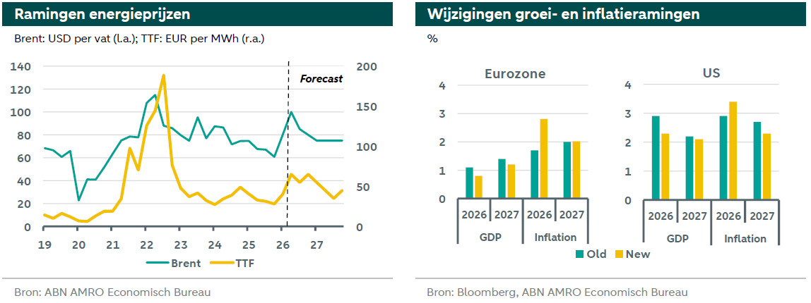 Na het uitbreken van het conflict in het Midden-Oosten en de daaruit voortvloeiende energieschok hebben wij verschillende scenario’s geschetst (zie hier), waarbij we onze ramingen vanwege de onzekerheid aanvankelijk ongewijzigd lieten. Inmiddels passen wij ons basisscenario wel aan, zij het met een relatief lage mate van ‘convictie’ gezien de uitzonderlijk hoge onzekerheid op dit moment. Ons nieuwe centrale scenario rust op twee pijlers. Ten eerste nemen wij geen expliciet standpunt in over de duur van het conflict zelf, maar veronderstellen wij dat de periode van ernstige verstoringen in de energievoorziening nog ongeveer twee maanden zal aanhouden, en daarmee tot ver in het tweede kwartaal doorloopt (waarbij verdere grote schade aan energie-infrastructuur wordt verondersteld beperkt te blijven). Ten tweede gaan wij ervan uit dat het normalisatieproces van energieprijzen geleidelijk verloopt en dat olie‑ en gasprijzen over onze ramingshorizon op een hoger niveau zullen uitkomen dan aan het begin van het conflict.