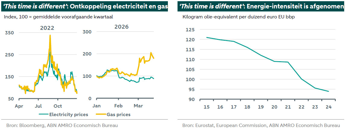 Hoewel de groei lager uitvalt dan in ons eerdere basisscenario, constateren wij dat de schok aanzienlijk kleiner is dan tijdens de energiecrisis van 2022‑2023, toen de economie gedurende vijf kwartalen stagneerde. Daar zijn drie redenen voor.