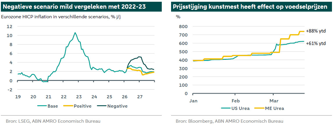 Als reactie hierop verwachten wij dat de ECB de rente al tijdens de Governing Council‑vergaderingen van april en juni zal verhogen, waarmee de depositorente uitkomt op 2,50%, om een mogelijke ontankering van de inflatieverwachtingen te voorkomen. We hebben meer vertrouwen in een renteverhoging in april dan in juni, gezien de aanhoudende onzekerheid rond het conflict. Het is goed mogelijk dat, indien het conflict eindigt en de energieprijzen snel normaliseren, de Governing Council voldoende zicht krijgt op de inflatievooruitzichten om in juni af te zien van een verdere renteverhoging. De verkrapping van het monetair beleid is erop gericht om te voorkomen dat zogeheten tweede‑ronde‑effecten van de energieschok doorsijpelen naar met name de arbeidsmarkt – iets wat we zagen na de energieschok van 2022, die samenviel met een relatief krappe arbeidsmarkt en werknemers ertoe aanzette hogere lonen te eisen ter compensatie van het reële‑inkomensverlies. Dit werkte uiteindelijk door in de diensteninflatie en leidde tot een kortstondige loon‑prijsspiraal. De combinatie van een kleinere initiële inflatieschok, preventieve verkrapping door de ECB, een hoger uitgangsniveau van de rente en een minder krappe arbeidsmarkt zou moeten voorkomen dat een dergelijke dynamiek zich ditmaal herhaalt.