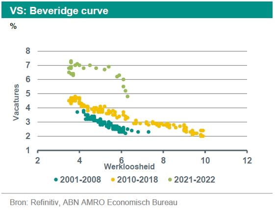 Om potentiële mismatches in sectoren te beoordelen is de Beveridge-curve een nuttig instrument. De werkloosheid wordt er in afgezet tegen de vacatures. Wanneer de krapte op de arbeidsmarkt haar hoogtepunt bereikt, beweegt de arbeidsmarkt naar de linkerbovenhoek van de curve (met hoge vacatures en lage werkloosheid). Beweegt de curve zijwaarts naar rechts, dan wijst dit op een mismatch tussen sectoren, aangezien de vacatures open blijven terwijl de werkloosheid hoger is. De Beveridge-curve van de VS laat zien dat de pandemie leidde tot massale fricties op de arbeidsmarkt, want de groene stippen tonen dat de curve zijwaarts verschuift. De arbeidsmarktfricties namen toe door de verschuiving van de consumentenvraag, die tijdelijke verschuivingen in de vraag naar arbeid veroorzaakte (bijvoorbeeld van diensten naar goederen, en nu weer naar diensten). Hoewel deze fricties op arbeidsmarkt tijdelijk zijn, omdat de lonen er uiteindelijk voor zorgen dat de werknemers opnieuw in de sectoren met vraag terechtkomen, kunnen zij op korte termijn de lonen doen stijgen. Met een werkloosheid van 3,4%, het laagste niveau in vijf decennia, is de werkloosheid volgens het Congressional Budget Office gedaald tot onder de drempel waar deze gemakkelijk inflatoir kan worden.