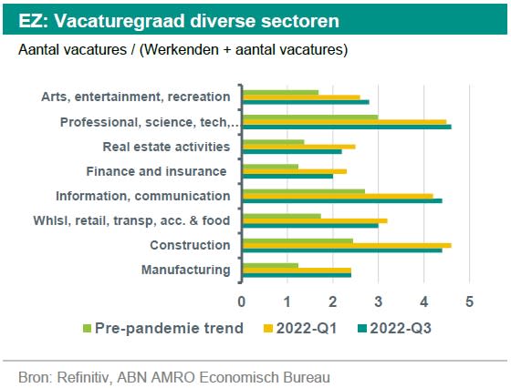 Afgaande op het aantal vacatures lijken de meeste segmenten van de arbeidsmarkt in de eurozone nog steeds zeer krap, hoewel de krapte in sommige sectoren in de loop van 2022 is afgenomen. Het vacaturepercentage voor de gehele economie is in het derde kwartaal gedaald tot 3,1%, tegen 3,2% in 2022Q2 (het pre-pandemie gemiddelde bedraagt 1,8%). Op sectorniveau is de vacaturegraad voor de contact-intensieve delen van de dienstensector (bv. toerisme, recreatie, amusement) tussen 2022Q1 en 2022Q3 toegenomen. Echter in sectoren waar de activiteit het meest gevoelig is voor het monetaire beleid en de ontwikkelingen op de huizenmarkt (bv. financiën en verzekeringen, vastgoed) is de vacaturegraad in die kwartalen gedaald. De vacaturegraad in de industrie stabiliseerde zich tussen 2022Q1 en 2022Q3.