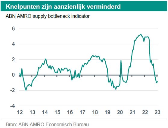 Na de massale verstoringen van de toeleveringsketens als gevolg van de pandemie en de heropening is onze ABN AMRO knelpuntenindicator weer gedaald tot het niveau van vóór de pandemie. Dit wijst erop dat de concurrentiedruk van de wereldhandel terug is en een neerwaarts risico vormt voor de doorberekening van de lonen in de prijzen. De bredere trend van de globalisering kan op langere termijn de concurrentiedruk verminderen.