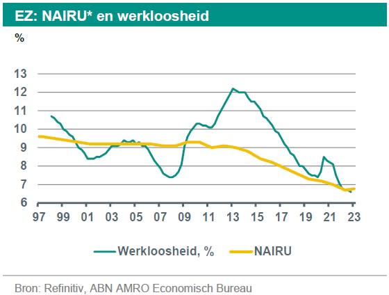 Terwijl de werkloosheid in december 2022 naar een historisch dieptepunt van 6,6 procent is gegaan, is het evenwichtspunt van de werkloosheid (die inschat wanneer de werkloosheid inflatoir wordt) sinds de crisis in de eurozone mee omlaag gegaan. Dit komt doordat landen arbeidsmarkthervormingen en hervormingen van de sociale zekerheid en pensioenstelsels hebben doorgevoerd. Deze hebben de activiteitsgraad in de eurozone helpen verhogen. Volgens schattingen van de Europese Commissie lag de werkloosheid eind 2022 zeer dicht bij de NAIRU. Dit betekent dat de werkloosheid bijna op het niveau ligt waarop zij inflatoir is. Het is echter mogelijk dat de NAIRU onder deze ramingen is gedaald, aangezien het effect van de hervormingen blijft doorwerken.