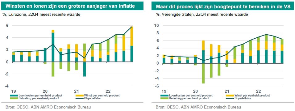 Op geaggregeerd niveau is er inderdaad bewijs dat toegenomen winsten bijdragen aan de inflatie in geavanceerde economieën. De en de hebben dit geconcludeerd door de bbp-deflator – de prijsverandering van binnenlands geproduceerde goederen en diensten – die een maatstaf is voor de binnenlands gegenereerde inflatie, te gebruiken. Bij het uitsplitsen van de deflator naar winsten, lonen en belastingen komen twee conclusies naar voren: 1) lonen en winsten dragen in toenemende mate bij aan de inflatie, en deze trend is sinds eind 2021 versterkt (in de eurozone); 2) winsten zijn sinds H2 2022 een grotere aanjager geworden dan lonen.