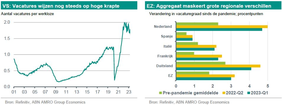 Als we de vacaturegraad zien als de beste indicator van een te grote vraag naar arbeid, dan rijst de vraag: zou het gebrek aan evenwicht tussen vraag en aanbod op de arbeidsmarkt kunnen worden opgelost door een daling van het aantal vacatures alleen, in plaats van een stijging van het arbeidsaanbod (dat – zonder verdere stijging van de toch al hoge participatiegraad, zoals in Nederland – een hogere werkloosheid impliceert)? In de VS is dit tot nu toe de trend geweest: het aantal vacatures is het afgelopen jaar met meer dan twee miljoen gedaald, terwijl de werkloosheid opmerkelijk stabiel is gebleven. In de eurozone zijn de vacatures ook gedaald (zij het nog steeds aan de hoge kant in Nederland en Duitsland), terwijl de werkloosheid nog verder is gedaald. Toekomstige ontwikkelingen zullen waarschijnlijk niet zo gunstig zijn. Het Bernanke-Blanchard document stelt dat – ervan uitgaande dat de recente relatie tussen vacatures en werkloosheid standhoudt (de zogenaamde Beveridge Curve) – de werkloosheid in de VS boven de 4,3% zal moeten stijgen, van de huidige 3,7%, om ervoor te zorgen dat de inflatie op de middellange termijn duurzaam daalt naar 2%. Uiteindelijk verwachten we dat de afnemende vraag de drijvende kracht zal zijn achter de stijging van de werkloosheid in zowel de VS als de eurozone in het komende jaar. In Duitsland is de werkloosheid de afgelopen maanden al met 0,6pp gestegen tot 5,6% en wij verwachten dat de totale werkloosheid in de eurozone eind dit jaar zal oplopen van 6,6% nu tot 7,4%. In de VS verwachten we een stijging naar 4,8% tegen het einde van 2024, omhoog van 3,7% in mei.