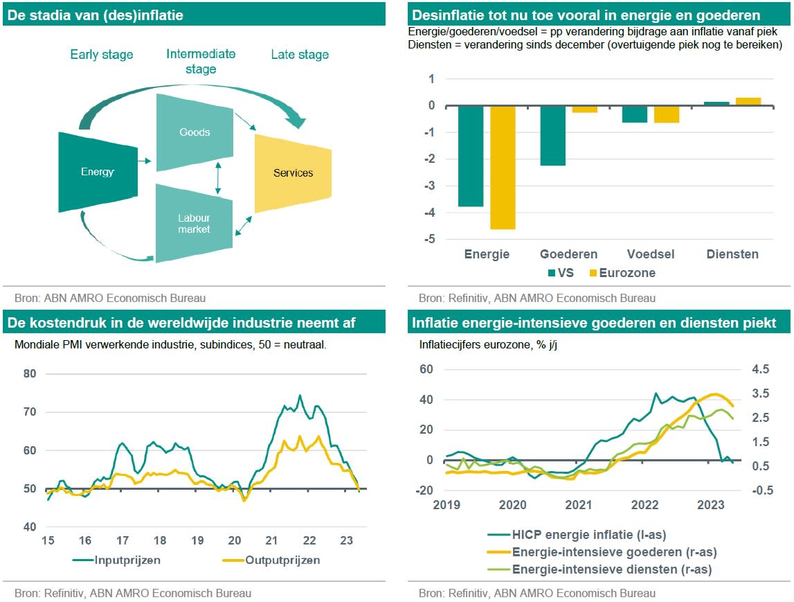 De tweede fase van de desinflatie – in goederen – is redelijk gevorderd in de VS maar komt net op gang in de eurozone. In de VS werd de goedereninflatie grotendeels aangedreven door (tweedehands) auto's, waarvan de prijzen gedaald zijn sinds de normalisatie van strubbelingen in toeleveringsketens. In de eurozone werd de goedereninflatie aangedreven door de doorberekening van de stijging van de aardgas- en elektriciteitsprijzen, en in deze categorie begint de inflatie nu te dalen als gevolg van de forse daling van de energieprijzen. Meer in het algemeen helpt de normalisering van de knelpunten in de mondiale toeleveringsketens om de inflatie van geïmporteerde goederen te verlagen – bijvoorbeeld door het in elkaar zakken van de vrachtkosten en een veel beter evenwicht tussen vraag en aanbod in de verwerkende industrie. De voedselprijsinflatie neemt ook eindelijk af, als gevolg van de vertraagde doorwerking van lagere groothandelsprijzen (die een hoogtepunt bereikten bij het uitbreken van de oorlog tussen Rusland en Oekraïne). Hoewel, in de eurozone, de meer energie-/arbeidsintensieve inflatie van verwerkte voedingsmiddelen enigszins hoog blijft.