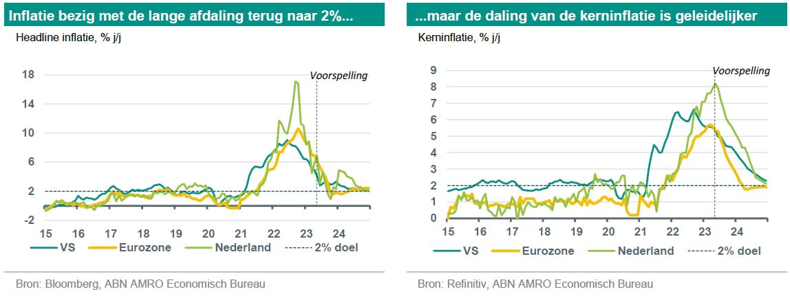 We hebben een lange weg afgelegd sinds de grote inflatieschok van 2021-22. De inflatie piekte in de VS vorige juni met 9,1% en in de eurozone met 10,6% in oktober. Sindsdien is de inflatie bijna net zo snel gedaald als gestegen, met zo'n 5 procentpunten in de VS en in dezelfde mate in de eurozone. Het snelle tempo van de desinflatie – die tot nu toe plaatsvond zonder een grote economische neergang – geeft reden tot optimisme dat een zogenaamde ‘vlekkeloze desinflatie' (inflatie die terugkeert naar 2% zonder significante economische schade) misschien toch mogelijk is. Hoewel we geen diepe economische neergang verwachten, denken we wel dat de desinflatie die nog moet komen niet zo pijnloos zal zijn als de beginfase. Wat de headline inflatie betreft, denken we dat de centrale banken hun streefcijfers van 2% relatief snel zullen bereiken (of benaderen) – binnen zes maanden voor de eurozone en binnen een jaar voor de VS. Maar de cijfers uit herinnerden ons er deze week aan dat de daling van de kerninflatie – met name voor diensten – waarschijnlijk langzamer zal verlopen en met meer onzekerheid omgeven zal zijn, aangezien dit ook afhangt van een afkoeling op de arbeidsmarkt. We blijven van mening dat er meer zwakte in de economie en een stijging van de werkloosheid nodig zal zijn om de inflatie duurzaam terug te brengen naar de streefcijfers van 2%. En waar de vraagoverschotten hardnekkiger blijken te zijn, zoals in het VK of hier in Nederland, zien we dat inflatie langer hoger dan de streefcijfers van de centrale bank blijft.