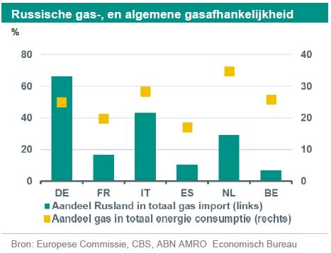De Nederlandse economie is minder afhankelijk van Russisch gas dan het eurozone gemiddelde. Dit neemt niet weg dat de huidige voorraadniveaus (48%) erop wijzen dat tekorten deze winter waarschijnlijk zijn. Ook maakt gas een groot deel van het totale energieverbruik uit (34%).