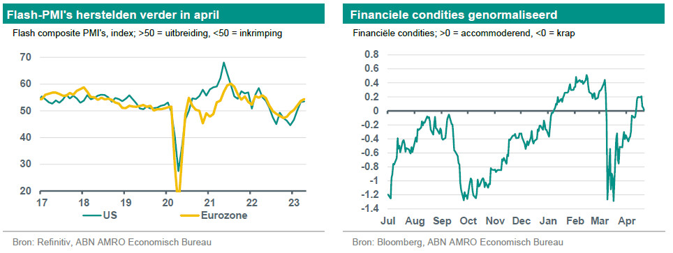Sinds onze publicatie van maart is de bezorgdheid over de banksector aanzienlijk afgenomen. De stromen naar geldmarktfondsen in de VS zijn afgenomen, in de banksector als geheel hebben de deposito's zich hersteld en de wekelijkse kredietgegevens zijn gestabiliseerd. Het sentiment op de financiële markten werd ondersteund door een reeks berichten over de bankresultaten in het eerste kwartaal, waaruit bleek dat kleine en middelgrote banken de turbulentie tot dusver goed doorstaan hebben. De Amerikaanse financiële-conditiesindex van Bloomberg heeft de verkrapping van maart volledig teruggedraaid en is nu ruimschoots in het accommoderende gebied beland. De dagelijkse uitgifte van kortlopende bedrijfsschulden (commercial paper) - die in maart kortstondig instortte - is nu weer normaal.