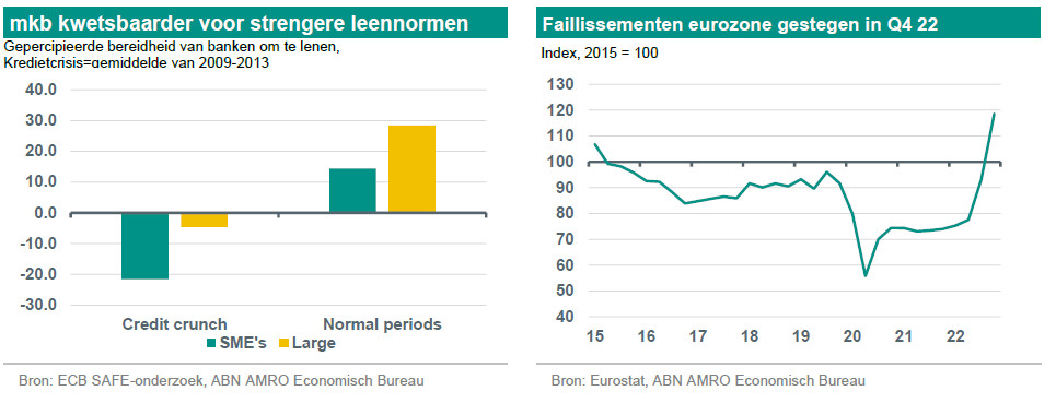Buffers zijn eerder een bron van kortetermijnverlichting dan van blijvende kracht. De verzachtende factoren zijn tijdelijk, wat betekent dat strengere kredietvoorwaarden uiteindelijk effect zullen sorteren. Tegelijkertijd zijn er, net als bij het vermogen van de huishoudens, aanzienlijke verschillen rondom het gemiddelde. Verschillen in bedrijdsomvang en sector zijn van belang, zoals bleek uit eerdere perioden waarin de kredietverlening werd beperkt. Tijdens de overheidsschuldencrisis daalde de kredietverlening door banken aan het mkb veel sterker dan aan grotere ondernemingen (zie onderstaande grafiek). Zelfs als het mkb nu hogere buffers heeft, zijn die waarschijnlijk kleiner dan de gemiddelden suggereren, wat betekent dat strengere kredietvoorwaarden nog steeds een impact zullen hebben. In een van de ECB werd ook een onderscheid gemaakt tussen "oude" en "jonge" ondernemingen, waarbij jonge ondernemingen (die doorgaans over onvoldoende buffers beschikken) in een klimaat van strengere kredietvoorwaarden veel grotere financieringsproblemen zullen ondervinden dan meer gevestigde ondernemingen.