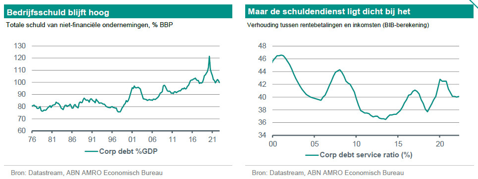 Niet-financiële ondernemingen in de eurozone hebben sinds de pandemie solide financiële buffers opgebouwd. Aan de inkomstenzijde zijn de winstmarges over het geheel genomen gestegen, waardoor de kassaldi ruim boven het niveau van vóór de pandemie zijn uitgekomen. Aan de kostenzijde zijn de schuldquote, ondanks de stijging van de rente sinds de tweede helft van vorig jaar, tot dusver stabiel gebleven en vertoont de schuld als percentage van het BBP in de meeste landen een dalende trend sinds de pandemie de kop opstak.