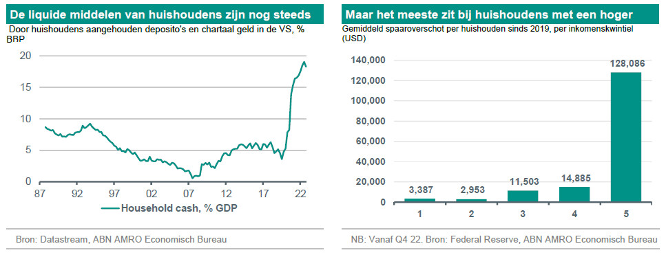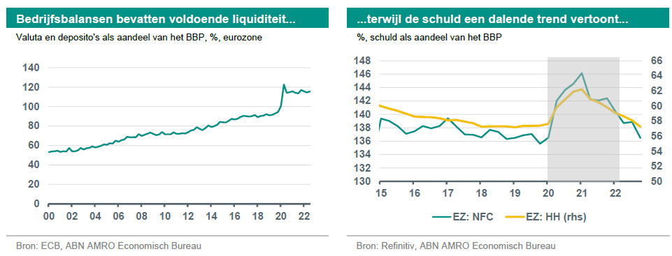 Onze verwachting van recessies in de VS en de Eurozone in 2023 was er al en blijft. Hoewel voor de Eurozone geldt dat de vooruitzichten op korte termijn zijn verbeterd door de afnemende energiecrisis en de opleving in China (zie kader 3). Een belangrijk argument tegen deze verwachte gematigde krimp is echter de kracht van de balansen van huishoudens en bedrijven, aan beide zijden van de Atlantische Oceaan. De tijdens de pandemie opgebouwde liquiditeitsbuffers betekenen dat het onwaarschijnlijk is dat het aantal faillissementen en de werkloosheid zo sterk zullen toenemen als in een zwaardere recessie. Laten we eens wat beter naar deze buffers kijken: