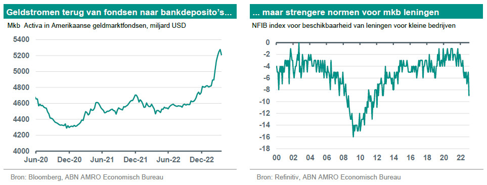 Tegenover deze positieve ontwikkelingen staat dat meer kwalitatieve of anekdotische bewijzen wijzen op een zekere verkrapping van de kredietvoorwaarden voor banken. De NFIB-enquête voor kleine bedrijven wijst op een aanzienlijke daling van de beschikbaarheid van leningen, waarbij deze subindex in maart het laagste niveau in elf jaar bereikte. Het Beige Book van de Fed van april wees vorige week ook op de toegenomen moeilijkheden bij het verkrijgen van krediet. Een belangrijk aandachtspunt voor de beleidsmakers zijn de driemaandelijkse bijwerkingen van de Senior Loan Officer's Survey (SLOOS) van de Fed en de Bank Lending Survey (BLS) van de ECB, die in de komende weken zullen verschijnen. Deze zullen waarschijnlijk een verdere aanscherping van de kredietvoorwaarden laten zien, al valt nog te bezien of een dergelijke aanscherping zal aanhouden.