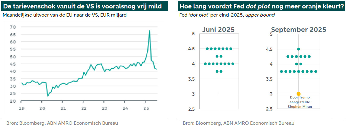 Sinds onze vorige Global Monthly zien we verdere tekenen van een afkoeling van de exportvraag vanuit de VS als gevolg van de Amerikaanse invoertarieven, hoewel die afkoeling zeer geleidelijk verloopt. Zo is de EU-export naar de VS bijvoorbeeld vooralsnog slechts met ongeveer -4,7% j/j gedaald – een zeer milde klap gezien de frontloading die we eerder dit jaar zagen (zie grafiek hieronder). Toch zagen we deze maand tekenen dat fabrikanten zich voorbereiden op een grotere vertraging die nog moet komen. De flash PMI’s voor de verwerkende industrie in Europa zijn weer onder het neutrale niveau van 50 gedaald, gedreven door dalende nieuwe orders. En in China hebben pogingen om de overcapaciteit te verminderen bijgedragen aan een flinke afkoeling van de investeringsgroei, na een redelijk veerkrachtige eerste helft van het jaar. Alles bij elkaar genomen blijven de recente macrodata consistent met ons basisscenario van een langdurige, zij het oppervlakkige, rem op de handel door Amerikaanse tarieven. In Europa zal dit uiteindelijk worden gecompenseerd door de positieve impuls van Duitse begrotingsuitgaven, terwijl we in China verwachten dat de autoriteiten net genoeg ondersteuning aan de vraagzijde zullen bieden om de economische groeivertraging beheersbaar te houden. Als zodanig zal deze zwakke periode van de mondiale groei waarschijnlijk tegen het begin van volgend jaar zijn vervaagd.