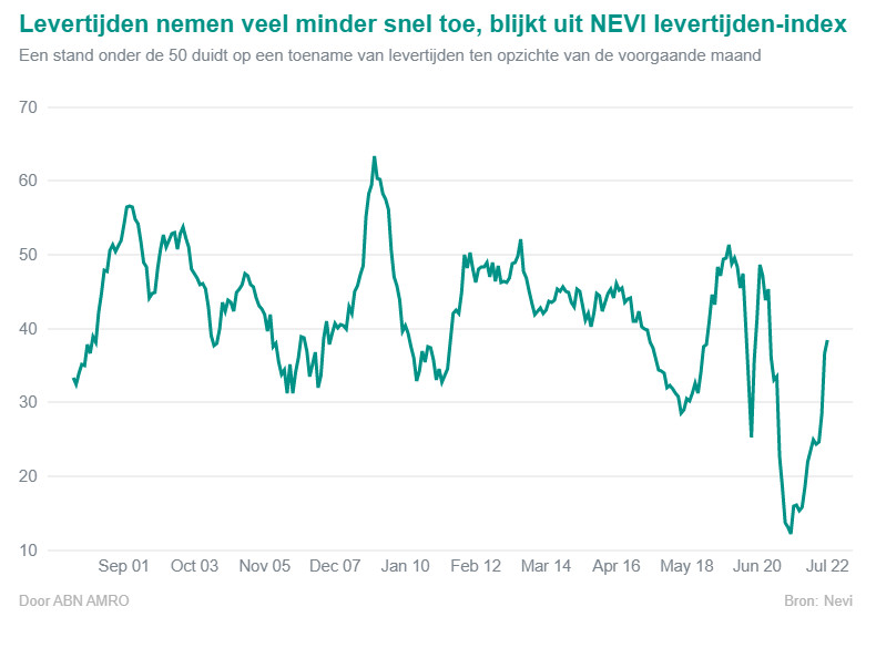 Behalve het negatieve internationale beeld wijzen ook verscheidene andere indicatoren erop dat de situatie verder kan verslechteren. De orderportefeuilles zijn in juli nauwelijks nog gegroeid. De voorraden gereed product zijn juist sterk gestegen; maar liefst 21 procent van de ondervraagde bedrijven zagen deze toenemen. Dit zijn duidelijke tekenen van zwakkere vraag, ook omdat toeleveringsketens nog steeds ontregeld zijn en de productie remmen. Indien de vraag naar industriële goederen de komende maanden afneemt en toeleveringsketens verder herstellen, kunnen orderportefeuilles gaan krimpen. Gelukkig hebben veel ondernemingen sinds eind 2020 een flinke portefeuille openstaande orders opgebouwd, met name producenten van kapitaalgoederen.