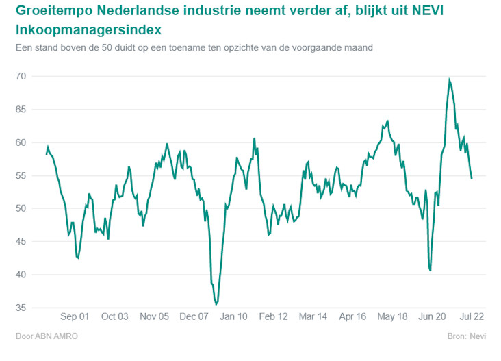 De NEVI Inkoopmanagersindex voor de Nederlandse industrie is verder gedaald, van 55,9 in juni naar 54,5 in juli, de laagste score in twintig maanden.