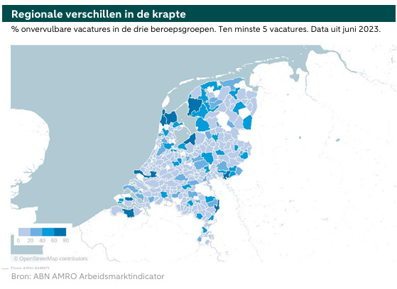 In deze publicatie gebruiken we de data allereerst via de ABN AMRO arbeidsmarktkrapte-indicator. Dit is een micro-gefundeerde indicator, welke lokale arbeidsmarkten aggregeert voor elke vacature. De ‘lokale arbeidsmarkt’ bestaat uit het aantal geïnteresseerde werkzoekenden per vacature die ook daadwerkelijk bereid zijn om naar een bepaalde vacature af te reizen. De indicator brengt per meetmoment het percentage onvervulbare vacatures in kaart, waarmee we een beeld krijgen over de gemiddelde arbeidsmarktkrapte. Voor meer informatie over de methodologie zie hier (p.7). Daarnaast kunnen we dankzij data van het UWV op een meer granulaire manier kijken naar de ‘ervaringsberoep’ en ‘wensberoep’ data.
