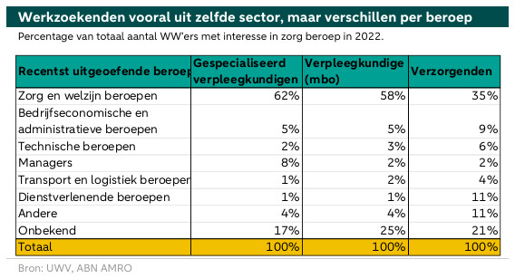 Binnen de zorgsector zien we ook dat de grootste interesse komt van personen die voorheen al in dezelfde beroepsgroep werkzaam waren. Zo komt de grootste interesse voor gespecialiseerd verpleegkundigen uit verpleegkundigen (mbo) of uit beroepen die als gespecialiseerd verpleegkundige worden gezien, zoals teamleiders zorg en hoofdverpleegkundigen, verpleegkundigen psychiatrie en gespecialiseerd verpleegkundigen.