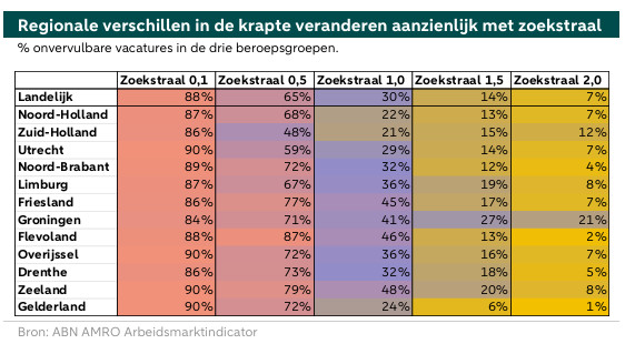 De krapte in de drie technische beroepsgroepen wordt minder gedreven door een beperkt aantal werkzoekenden, maar meer door de zoekstraal. De resultaten illustreren dat er forse verschillen zijn tussen gemeenten wat betreft de effectiviteit op kraptevermindering door een grotere zoekstraal. Zo blijft de krapte in Groningen met de grootste zoekstraalconversie (meer werkzoekenden koppelen aan meer vacatures) nog 21%. Hier heeft het dus minder zin om de zoekstraal te vergroten, en zien we dus een beperkt aantal werkzoekenden in deze beroepsgroepen. Hetzelfde geldt in mindere mate voor provincie Zuid-Holland (12%), Limburg (8%) en Zeeland (8%). Daarentegen zien we dat voor provincie Flevoland (2%) en Gelderland (1%) het tegenovergestelde gaande is.