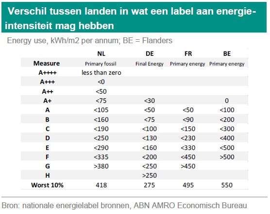 Energielabels - Om de vergelijkbaarheid in de hele EU te garanderen, worden energielabels (EPC) uiterlijk eind 2025 gebaseerd op een geharmoniseerde schaal van energieprestatieklassen. Deze energieprestatieklassen worden opnieuw ingedeeld (A-G). Gebouwen in klasse A moeten voldoen aan de hierboven beschreven ZEB-norm, terwijl gebouwen in klasse G overeenkomen met de slechtst 15% presterende gebouwen in het nationale gebouwenbestand op het moment van de invoering van de schaal. De overige klassen (B-F) hebben een gelijkmatige bandbreedteverdeling van energieprestatie-indicatoren over de energieprestatieklassen. Dit zou moeten leiden tot enige harmonisatie van het huidige ongelijksoortige systeem van EPC's in Europa (zie tabel op de volgende pagina), hoewel er aanzienlijke nationale verschillen zullen blijven bestaan. Bijvoorbeeld in Nederland worden gebouwen met 105 KWh/m2 intensiteit nu nog geclassificeerd als A.