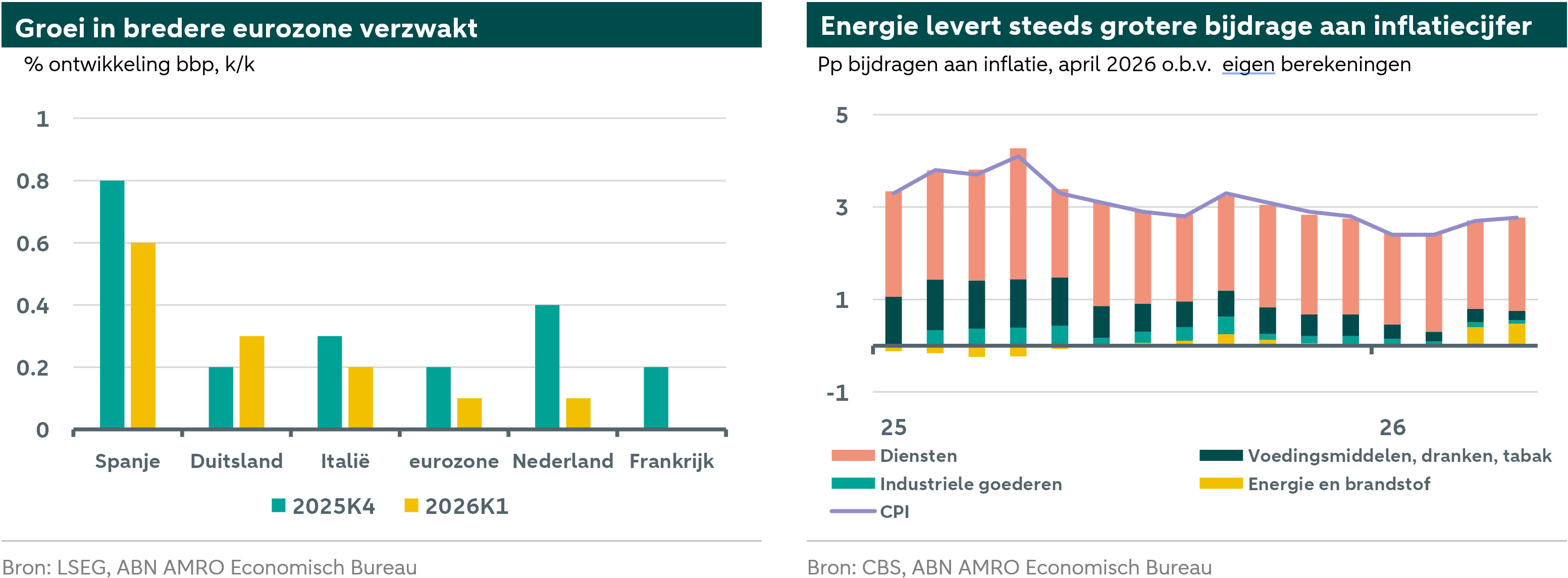 De economische groei is in het eerste kwartaal van dit jaar afgezwakt naar 0,1% k/k, een zwakker cijfer dan onze verwachtingen. Na een sterk 2025 verliest de economie aan vaart. Dit patroon is ook zichtbaar in de eurozone, waar de groeicijfers suggereren dat de economie 2026 met een zwakkere uitgangspositie inging dan verwacht.