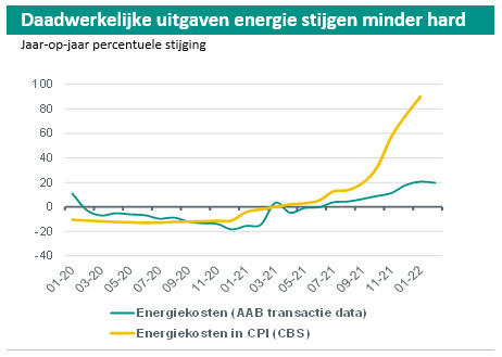 Toch zullen de directe effecten op de koopkracht in Nederland op dit moment meevallen, het effect van de huidige hoge energieprijzen wordt namelijk uitgesmeerd over verschillende maanden. Uit ABN Amro transactiedata blijkt dat in februari Nederlandse huishoudens gemiddeld slechts 20% meer uitgeven aan hun gasrekening in vergelijking met het vorige jaar (zie grafiek hieronder). Dit percentage is gelijk gebleven ten opzichte van de vorige maand. We schreven al dat dit verschil voornamelijk komt omdat ruim de helft van de Nederlanders een contract heeft van een looptijd van 1 of meer jaar.1 Daardoor is hun energierekening niet gestegen en in sommige gevallen zelfs gedaald vanwege de relatief milde winter ten opzichte van vorig jaar (lager verbruik) en de compensatie vanuit de overheid.