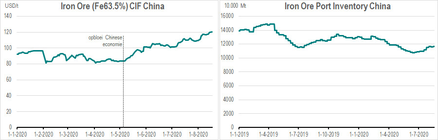 Maar ook in de ijzerertsmarkt drukte Covid-19 uiteindelijk het sentiment en dus de prijs. De bouw en auto-industrie kwamen stil te liggen en de Chinese vraag naar ijzererts daalde. Want veel Chinese staalfabrieken konden met de veel lagere bezettingsgraden in het begin van Covid-19 nog lange tijd putten uit hun eigen ijzerertsvoorraden. Bovendien waren de voorraden in de Chinese havens ook ruim voldoende.