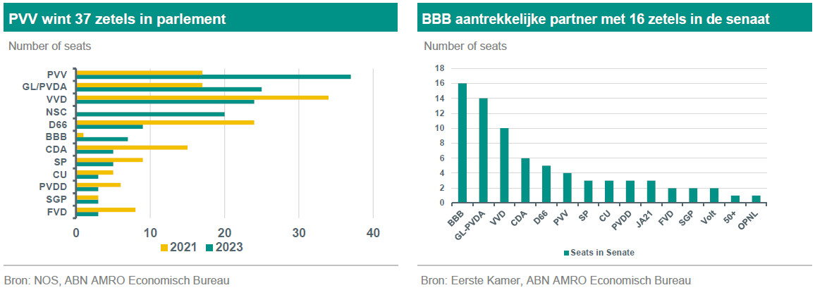 Voor een meerderheid in het parlement zijn 76 zetels nodig. Hoewel verschillende partijen sceptisch zijn geweest over het vormen van een coalitie samen met de PVV, zal Wilders moeten kijken naar twee van de andere drie grote partijen: GroenLinks/PvdA, VVD en NSC. Op basis van commentaar en ideologische verschillen is GroenLinks/PvdA uitgesloten waardoor een rechtse coalitie met VVD en NSC (81 zetels) het meest waarschijnlijk is. Als je BBB aan dit plaatje toevoegt - wat aantrekkelijk is vanwege de positie in de senaat - zou de coalitie 88 zetels hebben. In de senaat zou deze coalitie echter 30 zetels hebben, wat minder is dan de vereiste meerderheid van 38 zetels. Dit zou de beleidsambities van de coalitie beperken. Aangezien de PVV de duidelijke winnaar van de verkiezingen was, ligt het initiatief voor het formatieproces bij hen, wat op zich het proces zou kunnen versnellen. Aangezien NSC en VVD echter hun zorgen hebben geuit over sommige aspecten van het PVV-partijprogramma, kan er nog steeds een ingewikkeld onderhandelingsproces plaatsvinden. Sterker nog, de VVD heeft onlangs gesuggereerd dat ze niet in een toekomstig kabinet zou stappen, maar de coalitie als slapende partner zou steunen. In ieder geval zal het 2024 zijn voordat er een nieuw kabinet wordt geïnstalleerd.