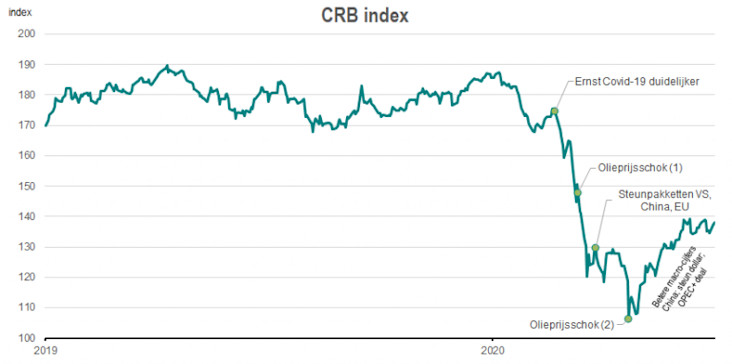 De gemiddelde prijsindex voor grondstoffen (de CRB-index) is de afgelopen maand met bijna 6% gestegen. China heeft hierin natuurlijk een aandeel. Want de positieve Chinese invoercijfers is ook investeerders in grondstofmarkten niet ontgaan. Het scherpe herstel in economische activiteit, met name in de industrie, vraagt om meer grondstoffen. Het V-vormige herstel was name bij de productie en de verkoop van personenauto’s erg indrukwekkend.