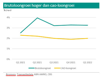 De brutoloongroei was de afgelopen jaren meestal lager dan de cao-loongroei, met name door de op de arbeidsmarkt. Sinds de coronacrisis is dat veranderd. De incidentele loongroei (het verschil tussen brutoloon en cao-loon) is nu positief. Wij denken dat de brutoloongroei hoger ligt dan de cao-loongroei door een combinatie van factoren. Ten eerste is er minder flexwerk dan vóór corona. Ten tweede kiezen mensen in reactie op de arbeidsmarktkrapte ervoor om de arbeidsmarkt te betreden en meer uren te werken. Een mogelijke derde factor vanaf het derde kwartaal van 2021 is dat werknemers de arbeidsmarkt betreden en meer uren werken in reactie op de hoge inflatie.