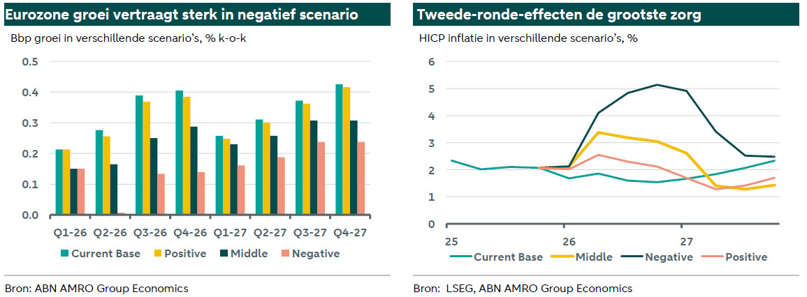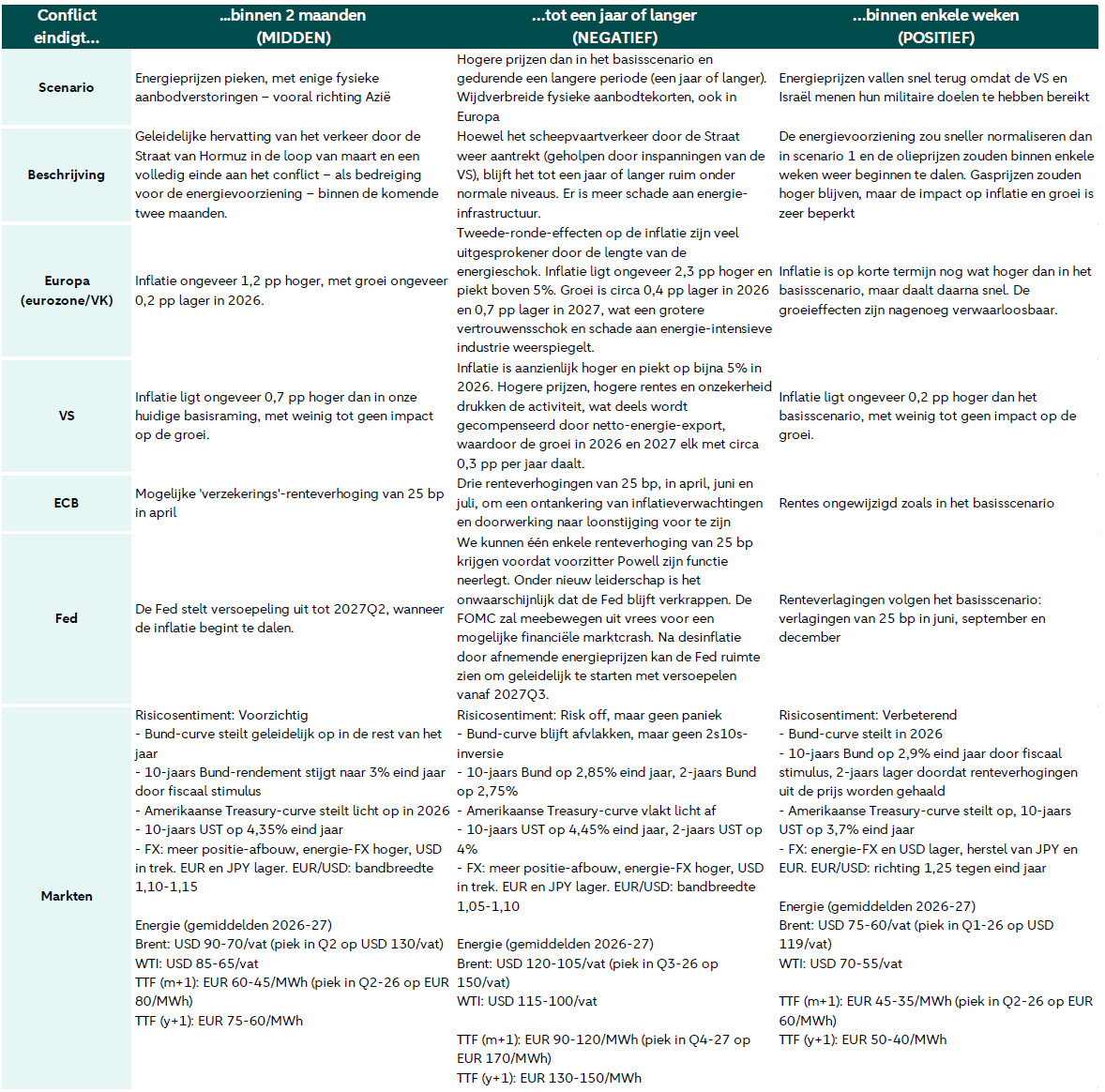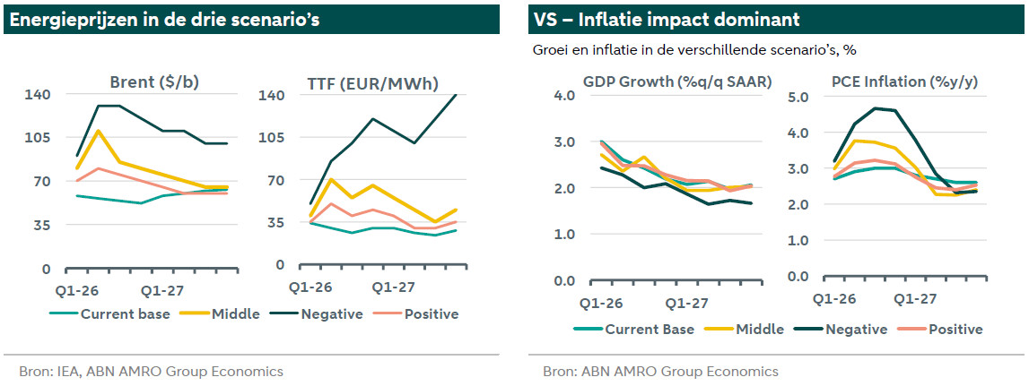 Midden - Einde van het conflict in de komende twee maanden – We zien een langzame hervatting van het verkeer door de Straat van Hormuz in de loop van deze maand en een volledig einde van het conflict – als bedreiging voor de energievoorziening – binnen de komende twee maanden. De olieprijzen blijven op korte termijn hoog – gemiddeld 110 dollar per vat in het tweede kwartaal – maar zouden vanaf het derde kwartaal beginnen te dalen. De Europese gasprijzen zouden in het tweede kwartaal stijgen tot gemiddeld 70 euro per megawattuur, met pieken tot 80 euro, en de prijzen zouden langer hoog blijven dan de olieprijzen vanwege de krapte op de gasmarkt (zie hier en luister voor meer informatie).