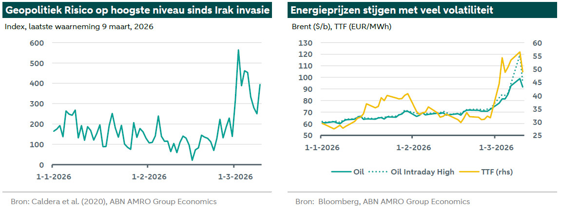 Vannacht zei de Amerikaanse president Trump dat het conflict ‘zeer binnenkort’ voorbij zou zijn, hoewel hij ‘nee’ antwoordde op de vraag of het deze week zou eindigen. De energiemarkten reageerden positief op zijn opmerkingen (zie grafiek rechtsboven), waarbij de olieprijzen weer onder de 100 dollar per vat daalden en de Europese gasprijzen weer onder de 50 euro per megawattuur daalden, na pieken van respectievelijk bijna 120 dollar en 70 euro op maandag. Toch zijn we nog lang niet uit de problemen. De opmerkingen van Trump waren vaag genoeg om het conflict nog enige tijd te laten voortduren. Het is ook onduidelijk of de VS de situatie volledig onder controle heeft. De Iraanse parlementsvoorzitter Mohammad Bagher Qalibaf reageerde door te zeggen dat Iran ‘absoluut’ niet streeft naar een staakt-het-vuren, en Iran is vandaag doorgegaan met aanvallen op infrastructuur in buurlanden. Het is ook onduidelijk of Israël de aanvallen zou staken, zelfs als de VS daarmee zouden stoppen.