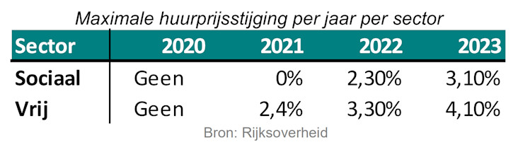 Door het groeiende woningtekort en de onbalans op de huurmarkt heeft het kabinet kaders gesteld voor de jaarlijkse huurprijsstijgingen. Deze maatregel beschermt huurders tegen hoge huurprijsstijgingen en behoud de betaalbaarheid van huurprijzen. Voor een periode van 3 jaar, 1 mei 2021 tot en met 1 mei 2024, zijn de huurverhogingen beperkt tot een maximum voor lopende contracten. De maximale verhoging wordt voor deze drie jaar elk jaar opnieuw vastgesteld en is verschillend voor de sociale huur- en de vrije huur sector (zoals hieronder weergeven). De huurverhoging is voor de sociale sector gebaseerd op de CAO-loonontwikkeling. Voor de vrije sector komt daar nog één procentpunt bovenop. Een verhuurder mag de (kale) huur niet meer verhogen dan het vastgestelde maximum. Daarnaast mag er geen nieuw contract worden aangeboden aan de zittende huurder met een hogere (kale) huur. Ook mag de verhuurder de huur niet opzeggen wanneer de huurder niet instemt met de verhoging.