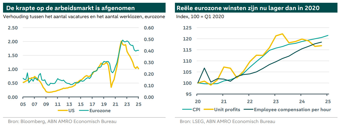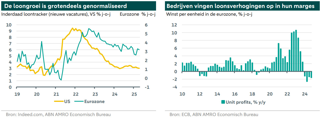 Wat is er sindsdien gebeurd? Te midden van alle onrust is de loongroei een van de weinige gebieden waar de ontwikkelingen grotendeels in de verwachtingen hebben gevolgd. Verschillende maatstaven voor de loongroei suggereren dat we voorbij de piek zijn en voorlopende indicatoren – zoals de Indeed-tracker voor nieuwe vacatures en de toekomstgerichte tracker van de ECB voor onderhandelde lonen – liggen al op of onder niveaus die op termijn verenigbaar zijn met een inflatie van 2% (zie onze nota van vorig jaar voor meer informatie hierover). Bovendien hebben bedrijven, in lijn met de verwachtingen van de ECB, een groot deel van de recente loonstijgingen inderdaad in hun marges opgevangen, en liggen de lonen nu grotendeels op pijl met prijsstijgingen sinds de energiecrisis van 2022. Zonder een nieuwe inflatoire schok lijkt een loon-prijsspiraal nu dan ook eerder een eventuele mogelijkheid dan een imminent risico. Zelfs als er zich een nieuwe inflatiepiek voor zou doen, is de krapte op de arbeidsmarkt nu aanzienlijk afgenomen, waardoor de kans op tweede ronde looneisen kleiner is geworden. De onderhandelingspositie van werknemers is simpelweg niet meer zo sterk als een paar jaar geleden.