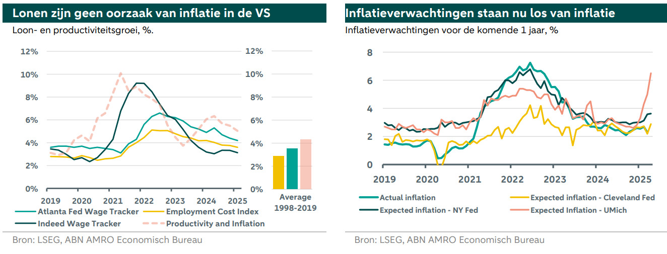 Voor de toekomst zijn het de inflatie, maar vooral de inflatieverwachtingen die bepalend zijn voor de loongroei. Deze laatste zijn namelijk een betere voorspeller van de toekomstige loongroei dan de huidige of zelfs toekomstige werkelijke inflatie. Onder invloed van zorgen over invoerheffingen zijn de inflatieverwachtingen in de VS recentelijk begonnen te stijgen. Dit komt het duidelijkst tot uiting in de enquête van de Universiteit van Michigan, waaruit blijkt dat consumenten over een jaar een inflatie van 6,5% verwachten, maar ook andere indicatoren van enkele regionale Fed-banken beginnen een stijging te vertonen. Meestal zijn deze sterk gecorreleerd met de huidige inflatie, maar nu laten ze een duidelijke divergentie zien. Hoewel dit het risico vergroot dat de lonen een bron van inflatoire druk worden, denken wij niet dat deze hoge verwachtingen uiteindelijk tot uiting zullen komen in de loongroei. Gezien de beperkte onderhandelingspositie van de Amerikaanse werknemers en de druk die de invoerheffingen al uitoefenen op de marges van Amerikaanse bedrijven, zal er weinig ruimte zijn voor snelle loonstijgingen die een bron van inflatie worden in plaats van een reactie daarop.