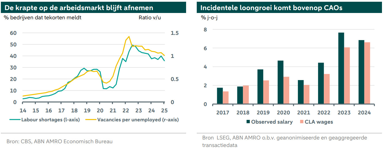 We verwachten dat de CAO-loongroei zal dalen tot gemiddeld 5% in 2025 en 4% in 2026, na een piek van 6,6% in 2024. De loongroei wordt gedreven door de inflatieverwachtingen voor de toekomst, de krapte op de arbeidsmarkt en de inhaalbeweging van de nominale lonen ten opzichte van het prijspeil. De inflatieverwachtingen zijn nog steeds hoog en zijn geleidelijk weer gaan stijgen, in nauwe samenhang met de werkelijke inflatiecijfers. Dit wijst erop dat werknemers zich in de toekomst willen beschermen tegen nieuw koopkrachtverlies, waardoor de huidige loondruk verder zal toenemen, zij het in veel mindere mate dan tijdens de inflatietop. De krapte op de arbeidsmarkt, weergegeven door de verhouding tussen vacatures en werklozen, blijft afnemen. Toch blijft de arbeidsmarkt relatief krap en geven bedrijven consequent aan dat een tekort aan arbeidskrachten hun grootste obstakel is. Dit betekent dat de onderhandelingspositie van werknemers blijft bestaan, zij het in mindere mate dan in de afgelopen twee jaar. Ten slotte hebben de lonen het prijsniveau grotendeels ingehaald. Wanneer we kijken naar de loongroei boven de reguliere CAO-groei, zoals in sectoren zonder CAO of voor incidentele loonstijgingen zoals promoties of verandering van baan, is de loongroei hoger geweest dan de officiële CAO-statistieken. De inhaalbeweging ten opzichte van de prijzen betekent minder opwaartse druk op de looneisen. Per saldo verwachten we dat de loongroei zal blijven dalen.