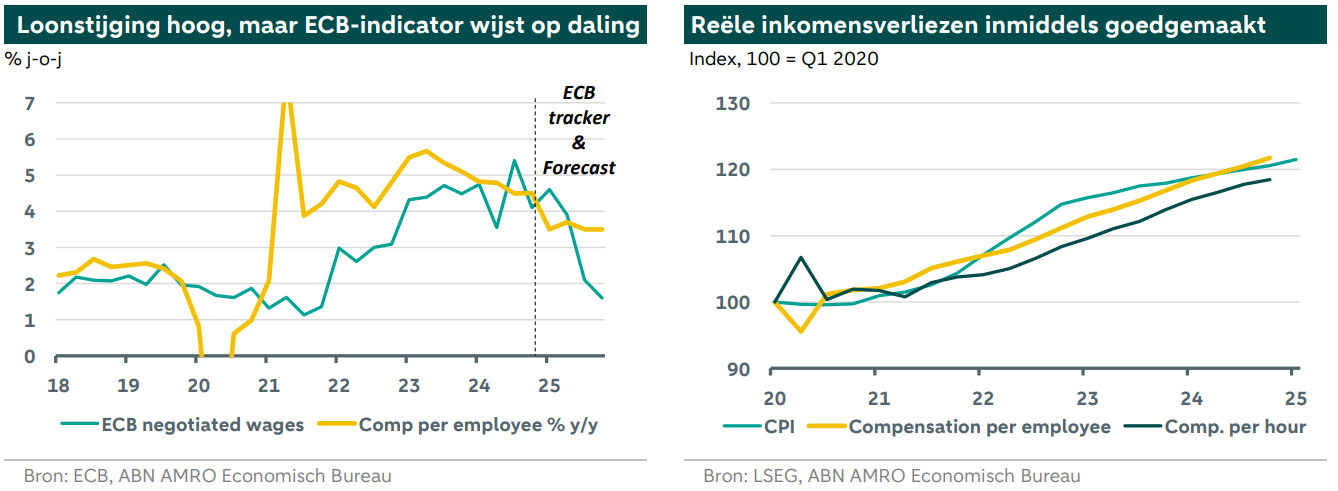 Sinds onze publicatie over loongroei begin vorig jaar wijzen verschillende maatstaven erop dat de loongroei in de eurozone een piek bereikt, terwijl de vooruitkijkende indicatoren wijzen op een scherpe daling tegen het einde van dit jaar. Concreet is de maandelijkse tracker van Indeed van 3-4% naar 2,5-3,5% gedaald, wat volgens ons in lijn is met de inflatiedoelstelling van 2% die de ECB op termijn wil halen. De onderhandelde lonen en de loonkosten per werknemer (de meest uitgebreide loonmaatstaf die de voorkeur van de ECB geniet) blijven met ongeveer 4% in het vierde kwartaal van 2024 aan de hoge kant. Dit zijn echter sterk achterlopende indicatoren, die grotendeels een weerspiegeling zijn van loonafspraken die een jaar of langer geleden zijn gemaakt. De toekomstgerichte tracker van de ECB voor onderhandelde lonen wijst ondertussen op een scherpe daling tot slechts 1,6% in het vierde kwartaal van 2025, of 3% exclusief bonussen. Het cijfer voor het vierde kwartaal van 2025 is gebaseerd op overeenkomsten die 43% van de werknemers in zes grote economieën van de eurozone vertegenwoordigen. Hoewel de dekking natuurlijk kleiner wordt naarmate de prognoseperiode verder in de toekomst ligt, heeft de tracker een redelijk goede staat van dienst wat betreft het voorspellen van gerealiseerde onderhandelde lonen. Dit komt ook overeen met het signaal van de eerder genoemde Indeed-tracker voor nieuwe vacatures.