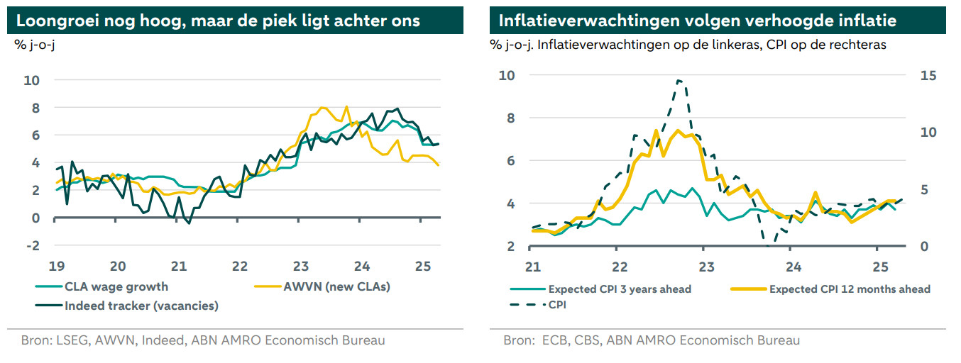 Door de hogere inflatiepiek in 2022 heeft Nederland een grotere looninhaalbeweging doorgemaakt, wat heeft geleid tot grotere tweede-ronde-effecten op de prijzen van diensten. Vanaf de piek van 7% j-o-j in juli 2024 daalt de loongroei geleidelijk. Indicatoren zoals de AWVN-maatstaf voor de groei van nieuwe cao's en de Indeed-tracker voor nieuwe vacatures wijzen op een voortzetting van deze neerwaartse trend. In april daalde de AWVN-maatstaf voor het eerst in tweeënhalf jaar onder de drempel van 4%.