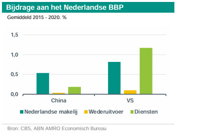 Wij denken dat de macro-economische impact van de handelsspanningen tussen de VS en China op Nederland beperkt blijft, maar schaarste van kritieke grondstoffen zou bijvoorbeeld kunnen leiden tot prijsstijgingen, beleidsuitdagingen en operationele vertragingen (lees hier meer). Bovendien was in de jaren 2015-22 gemiddeld ongeveer 8% van de totale Nederlandse goederenimport afkomstig uit China en ook uit de VS. Uit China afkomstig is ongeveer 55% aan machines en transportmiddelen (vooral computers, telefoons, zonnepanelen etc.). Dit betekent dat sectoren of ontwikkelingen die afhankelijk zijn van deze import beïnvloed kunnen worden, zoals de telecomsector of de energietransitie die afhankelijk is van zonnepanelen. Ongeveer tweederde van alle import uit China wordt echter weer geëxporteerd. Wat betreft de Nederlandse goederenexport gaat in de jaren 2015-22 gemiddeld ongeveer 4,2% naar de VS en 2,1% naar China. Het grootste deel van de toegevoegde waarde van de handel met China voor de Nederlandse economie komt van de export van in Nederland geproduceerde goederen. In de periode 2015-20 droeg de export van in Nederland geproduceerde goederen naar China gemiddeld 0,5% bij aan het bbp, terwijl de bijdrage van de wederuitvoer vrijwel te verwaarlozen was. Over het geheel genomen is de directe blootstelling van de Nederlandse export relatief klein en we verwachten dat - zelfs in een scenario waarin de risico's verder worden verminderd - de export naar China zal doorgaan.
