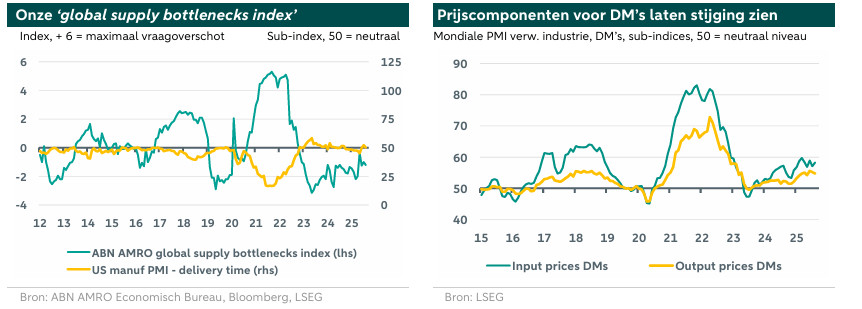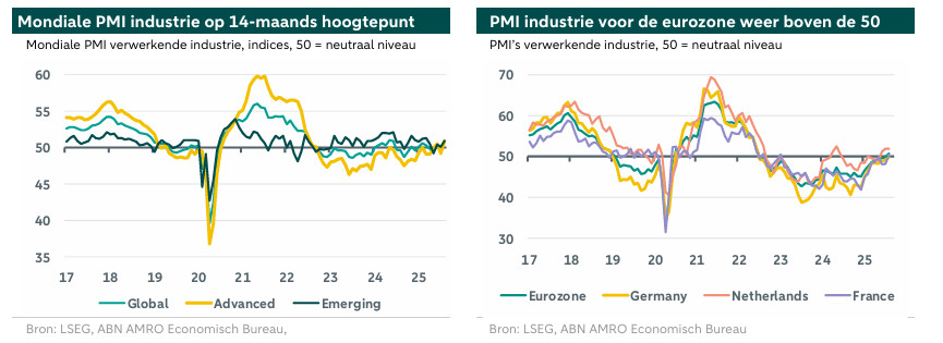 Mondiale inkoopmanagersindex verwerkende industrie op hoogste niveau in 14 maanden. Opmerkelijke verbeteringen in de VS (ten dele) en de eurozone. Wereldwijd aanbodoverschot houdt aan; grootste aanbodschok door tarieven achter de rug. Kostprijsdruk vanuit industriële producten neemt toe, vooral in de VS.