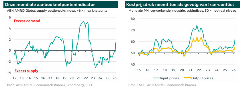De verlenging van de levertijden is slechts één van de aanwijzingen voor verstoringen aan de aanbodzijde die voortkomen uit het conflict met Iran. Tot nu toe concentreren deze verstoringen zich logischerwijs vooral in energiegerelateerde sectoren. Desondanks kunnen er aanvullende knelpunten ontstaan indien het staakt‑het‑vuren geen stand houdt en/of het conflict opnieuw escaleert. Denk bijvoorbeeld aan een mogelijke sluiting van de Bab al‑Mandab‑straat – die de Rode Zee met de Golf van Aden verbindt – door de aan Iran gelieerde Houthi’s. Dit zou de mondiale scheepvaart veel breder verstoren dan alleen de energiestromen.