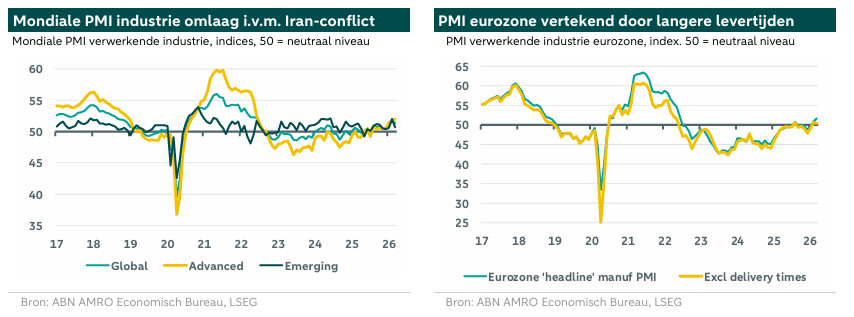 Na in februari te zijn gestegen tot het hoogste niveau in 44 maanden van 51,8, is de mondiale inkoopmanagersindex (PMI) voor de verwerkende in maart teruggevallen naar 51,3. Dit lijkt voor een groot deel samen te hangen met de escalatie van het conflict tussen de VS/Israël en Iran, dat op 28 februari begon. De verslechtering in maart kwam vooral op het conto van de opkomende markten (EM): de EM-index viel terug naar 50,7 (februari: 52,0). Dit werd deels veroorzaakt door de Chinese PMI van RatingDog (opgenomen in de mondiale index), die na een eenmalige stijging tot 52,1 in februari weer terugzakte naar 50,8. Dit weerspiegelt grotendeels een verslechtering van de exportvooruitzichten als gevolg van het Iran‑conflict, waarbij de Chinese exportsubindex na een opleving in februari weer scherp daalde. In India daalde de PMI voor de verwekende industrie in maart nog sterker, wat de grote afhankelijkheid van het land van olie‑importen uit het Midden-Oosten weerspiegelt. Het overeengekomen staakt‑het‑vuren tussen de VS/Israël en Iran zou kunnen betekenen dat de impact van het conflict uiteindelijk tijdelijk blijkt, al oogt het akkoord nog steeds fragiel en is het te vroeg om hier sterke conclusies aan te verbinden (zie ook ons rapport Iran ceasefire: Is this a turning point?, gepubliceerd op 8 maart).
