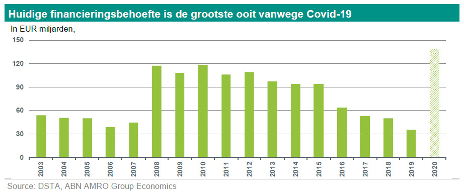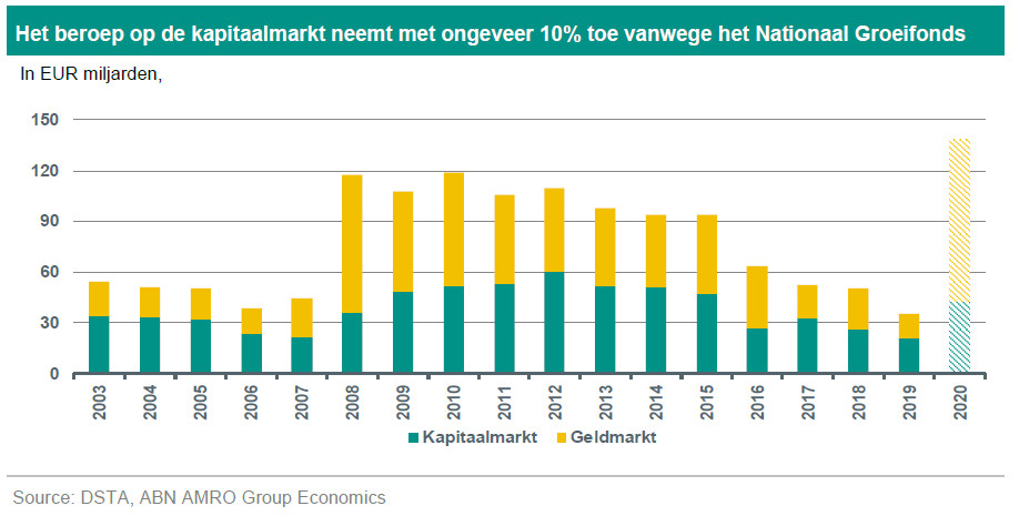 Het Nationaal Groeifonds verhoogt de Nederlandse financieringsbehoeften met EUR 20 miljard in de komende jaren. Gezien de huidige economische omstandigheden acht het kabinet het onverstandig om te bezuinigen, daarom worden de geraamde uitgaven ten laste van het saldo gelegd. Dit betekent dat de impact van het Nationaal Groeifonds op de Nederlandse financieringsbehoefte gemiddeld genomen ongeveer EUR 4 miljard per jaar bedraagt voor de komende vijf jaren. Het geld voor het fonds wordt pas opgehaald als het is toegekend aan een project. Op basis hiervan verwachten we dat in 2021 ongeveer EUR 1 miljard nodig is en de jaren er na meer. Na deze periode wordt het Nationaal Groeifonds geëvalueerd en is een nieuwe tranche mogelijk. In vergelijking met de huidige Nederlandse financieringsbehoefte voor 2020 van EUR 138,8 miljard is de impact van het Nationaal Groeifonds op de financieringsbehoefte beperkt (). Echter is de huidige financieringsbehoefte de grootste ooit, zoals te zien is in onderstaande grafiek. Dit komt met name door de maatregelen die het kabinet heeft genomen in het licht van de corona crisis.