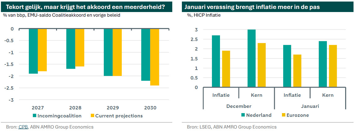 Zoals verwacht hebben verkiezingswinnaar D66, de VVD en het CDA een akkoord bereikt voor het vormen van een minderheidscoalitie. Op 30 januari presenteerden de drie partijen hun coalitieakkoord. Centraal daarin staat een sterke verhoging van de defensie-uitgaven om te voldoen aan de nieuwe NAVO‑norm. De nieuwe regering wil de defensiebegroting laten toenemen van ongeveer 2% van het bbp nu, naar 2,8% in 2030 en 3,5% in 2035. Dat is een ambitieuze doelstelling, vooral met het oog op aantrekken van defensiepersoneel in een zeer krappe arbeidsmarkt. De meeste andere maatregelen zijn erop gericht dit doel te ondersteunen. Bezuinigingen, met name in de zorg en sociale zekerheid (waaronder het verkorten van de WW-duur van twee naar één jaar), en een hogere inkomstenbelasting moeten de investeringen financieren. Volgens doorrekeningen van het CPB vallen de begrotingstekorten en de schuld‑bbp‑ratio’s in de komende vier jaar daardoor slechts marginaal hoger uit dan onder het vorige beleid.