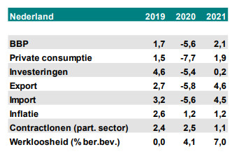 In het derde kwartaal van dit jaar zal de Nederlandse economie met 4,3% groeien. Dat maakt de scherpe daling van 8,5% in het tweede kwartaal lang niet goed. We verwachten een krimp van 5,6% in dit jaar en een mager herstel van 2,1% volgend jaar. Investeringen herstellen zich gedeeltelijk na krimp in 2020. Wereldhandel veert sterk terug na dip in tweede kwartaal maar is nog niet terug op het oude niveau. Werkloosheid nu nog grotendeels verborgen, maar loopt gestaag op naar 8,5% eind 2021. Besteedbaar inkomen stagneert in 2021 en 2022.