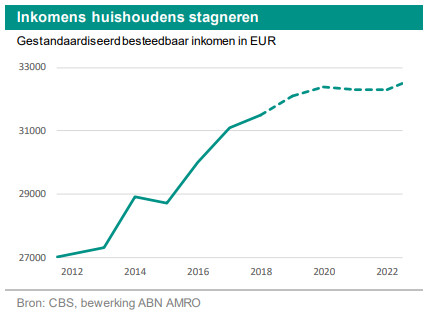 Deze vier verschijnselen komen bovenop de stijgende werkloosheid, die de inkomens van veel huishoudens onder druk zet omdat uitkeringen lager zijn dan lonen. Gestandaardiseerd – dus gecorrigeerd voor verschillen in grootte en samenstelling van het huishouden – verwachten we dat het gemiddelde besteedbaar inkomen in Nederland na enkele jaren van stijging, stagneert. Dit is nog niet gecorrigeerd voor de inflatie. Het reëel besteedbaar inkomen zal in de komende twee jaar dus dalen.