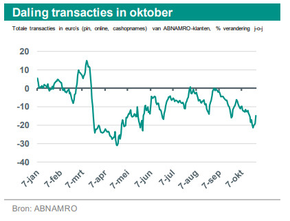 In lijn met onze eerdere analyse blijkt dat, ondanks dat de lockdownmaatregelen werden opgeheven in juli, de consumptie op een structureel lager niveau blijft hangen. Over de gehele linie zien we dat ook in het derde kwartaal de consumptie onder het niveau van 2019 blijft, mede door de ‘anderhalvemeterregels’, de aanhoudende vrees voor besmetting en de verhoogde inkomensonzekerheid. Een analyse van onze pintransacties laat tevens zien dat in de aanloop naar de tweede golf in september, de consumptie weer verder verslechterde. Dit werd verder versterkt door de maatregelen die het kabinet nam op 12 oktober. Sinds deze ‘gedeeltelijke lockdown’ zien we de totale bestedingen van consumenten gemeten door de pin- en creditcardtransacties, onlinetransacties en cashopnames met gemiddeld 16% j-o-j terugvallen. Ter vergelijking; tijdens de eerste ‘intelligente lockdown’ daalden de pintransacties met gemiddeld zo’n 20% j-o-j (medio maart t/m eind mei). [1]